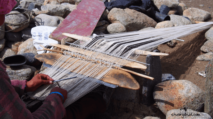 Lhamo est installée devant sa tente. Comme beaucoup de femmes, elle passe une grande partie de ses journées au tissage. Ici, le métier à tisser est astucieusement réduit à quelques pièces de bois qui se fixent par terre grâce à des pierres, le rendant ainsi aisé à transporter d’un camp à l’autre. Les tapis et les couvertures sont en laine de yak, mais les fils de trame sont en laine de mouton. De la laine colorée achetée en ville est néanmoins ajoutée pour créer quelques motifs. Les tapis et les couvertures sont évidemment très importants dans leur vie montagnarde.