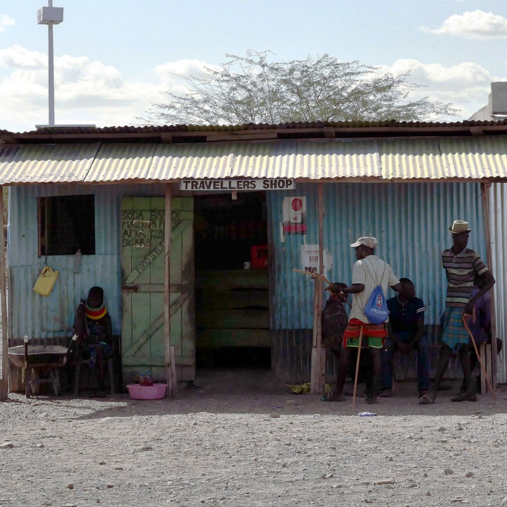 J’arrivai bientôt à Kaaling, une bourgade de quelques milliers d’habitants. Après avoir traversé à pied la rivière asséchée, je marchais dans la rue principale bordée de boutiques souvent faites de tôles sous les regards des gens dont une grande part avaient revêtu le costume classique des Turkanas. Le village était trop petit pour posséder une guesthouse, mais Margaret, la gérante de « Mama Kafia and daughter » (Mama Kafia la propriétaire, vivait à Nairobi), un magasin vendant plus particulièrement des vêtements, mais aussi des sandales, des sodas et autres boissons énergétiques et tout un tas d’autres choses, me dit qu’elle avait une chambre de libre. Je la suivais dans la boutique et passais par la porte de derrière qui débouchait sur une cour entourée de bâtiments contenant des chambres, une cuisine, un salon ou encore une mosquée, peinte en vert avec en bleu l’étoile et le croissant de lune à côté du nom du lieu de culte : Mosque Noor. Une poignée de musulmans somalis venaient y prier chaque jour. Elle me montra une des chambres disponibles. Derrière la porte en bois, c’était évidemment rustique : sur un sol en béton, un lit sans oreiller et une table constituaient le seul mobilier. À l’opposé de la porte, une petite fenêtre fermée par des volets de bois éclairait faiblement la pièce. Mais c’était suffisant pour moi. Margaret me la proposa pour 1000 shillings (8€) la nuit. C’était un peu cher pour ce que c’était, mais tout était cher au Turkana, et encore plus dans ces endroits éloignés. Et puis ça rentrait dans mon budget de toute façon. Une seule des pièces de cette cour était électrifiée, et uniquement le soir : celle qui contenait la télévision et où on se réunissait à partir de 19 heures pour regarder une série indienne ou des matchs de football de la ligue anglaise.