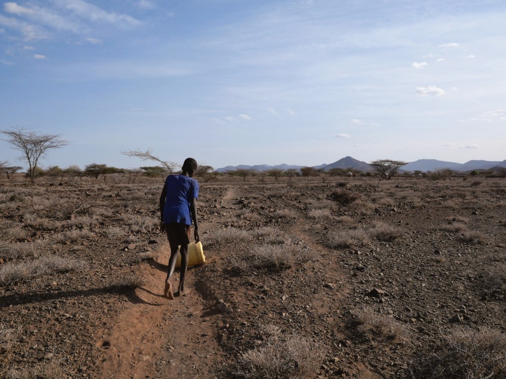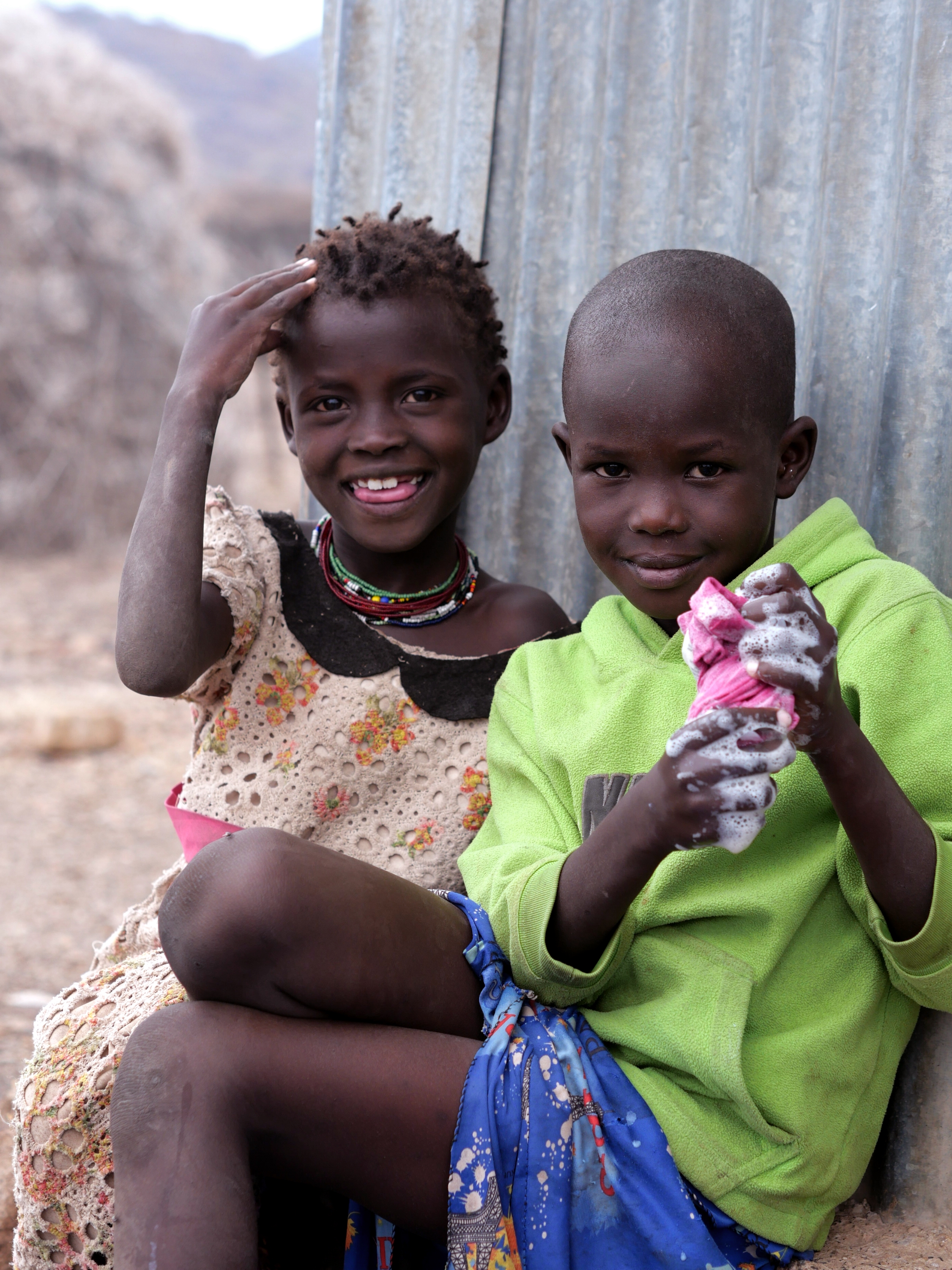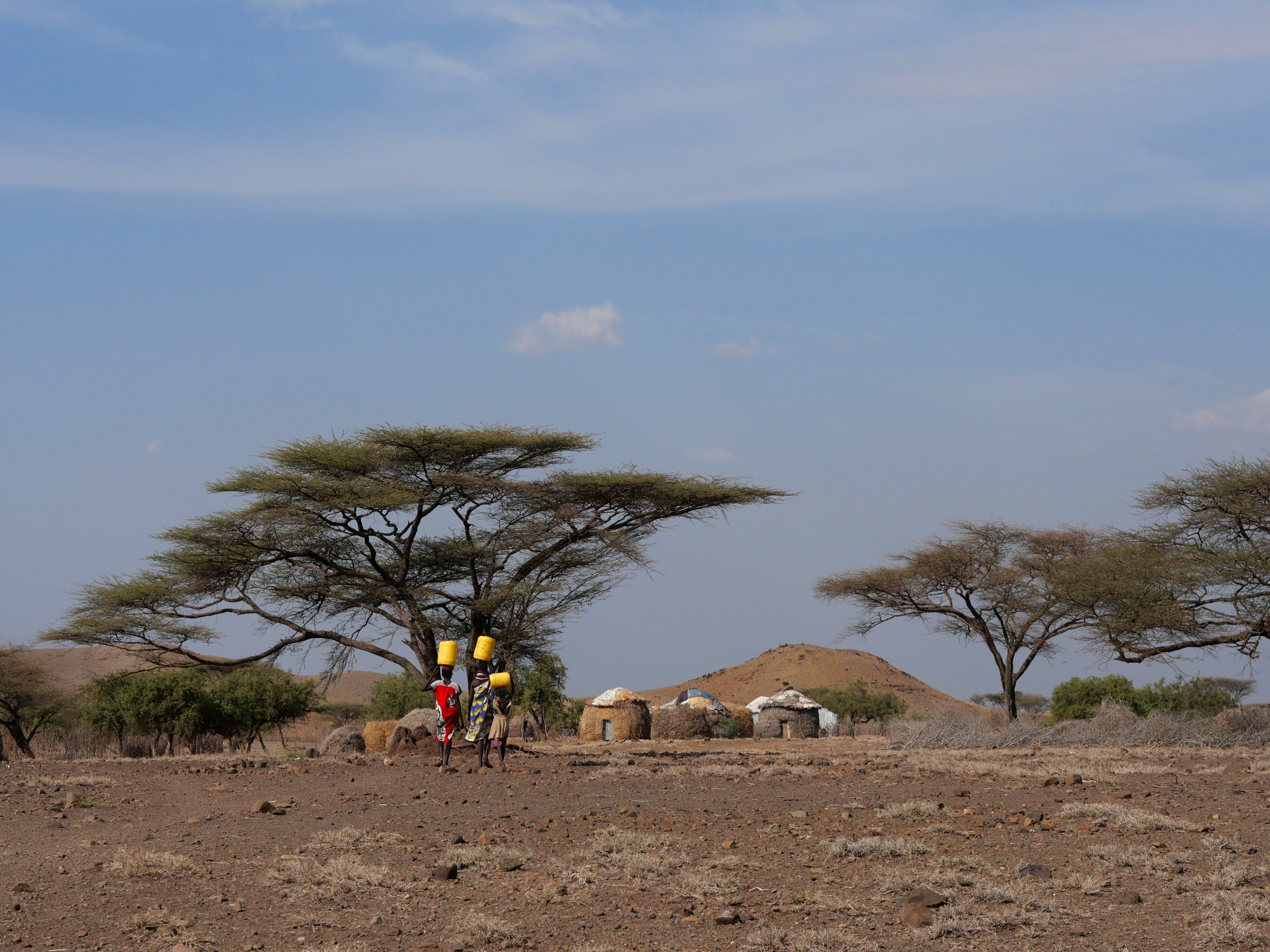 Après avoir mangé un plat de haricots rouges, c’était justement l’heure de la corvée d’eau. J’accompagnais le garçon qui avait pris un jerrican de 20 L. La pompe n’était pas très loin, quelques centaines de mètres, et fonctionnait grâce à des panneaux solaires. Sur place il fallait faire la queue parmi des femmes et adolescentes. Les tâches étaient très genrées au Turkana. Les femmes repartaient l’une après l’autre avec un bidon jaune sur la tête, mais quand le bidon de mon jeune hôte fut plein, c’est en le faisant rouler de ses pieds nus sur le petit sentier qu’il amenait l’eau jusqu’à chez lui. Un homme ne porte jamais de charges sur la tête, ce serait un déshonneur pour lui.