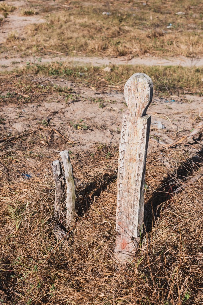Il me restait une chose à voir : les hommes de pouvoirs, ceux qui faisant partie de la plus importante société secrète appelée Gohu, avaient le droit après leur mort à une sculpture spéciale pour leur koma, bien plus grande et sculptée avec plus de soin, souvent même peinte, appelée kigango (vikango au pluriel). Je demandai à Rashidi de m’en montrer un. Nous remontions donc sur sa moto et poursuivâmes notre chemin jusqu’à une maison où une vieille femme m’accueillit avec une joie non dissimulée. Dans la cour se trouvaient trois petits koma et un grand kigango qui m’avaient paru être laissés à l’abandon. Je pouvais observer gravés sur le kigango des motifs triangulaires et même des yeux et une bouche formant un visage dans un style très simple rappelant les dessins d’un enfant. Des traces colorées rouges ou jaunes semblaient suggérer qu’il avait autrefois été peint. Je donnais 100 shillings à la dame pour la remercier. Elle me confia avec un grand sourire qu’elle achèterait du mnazi avec cet argent.