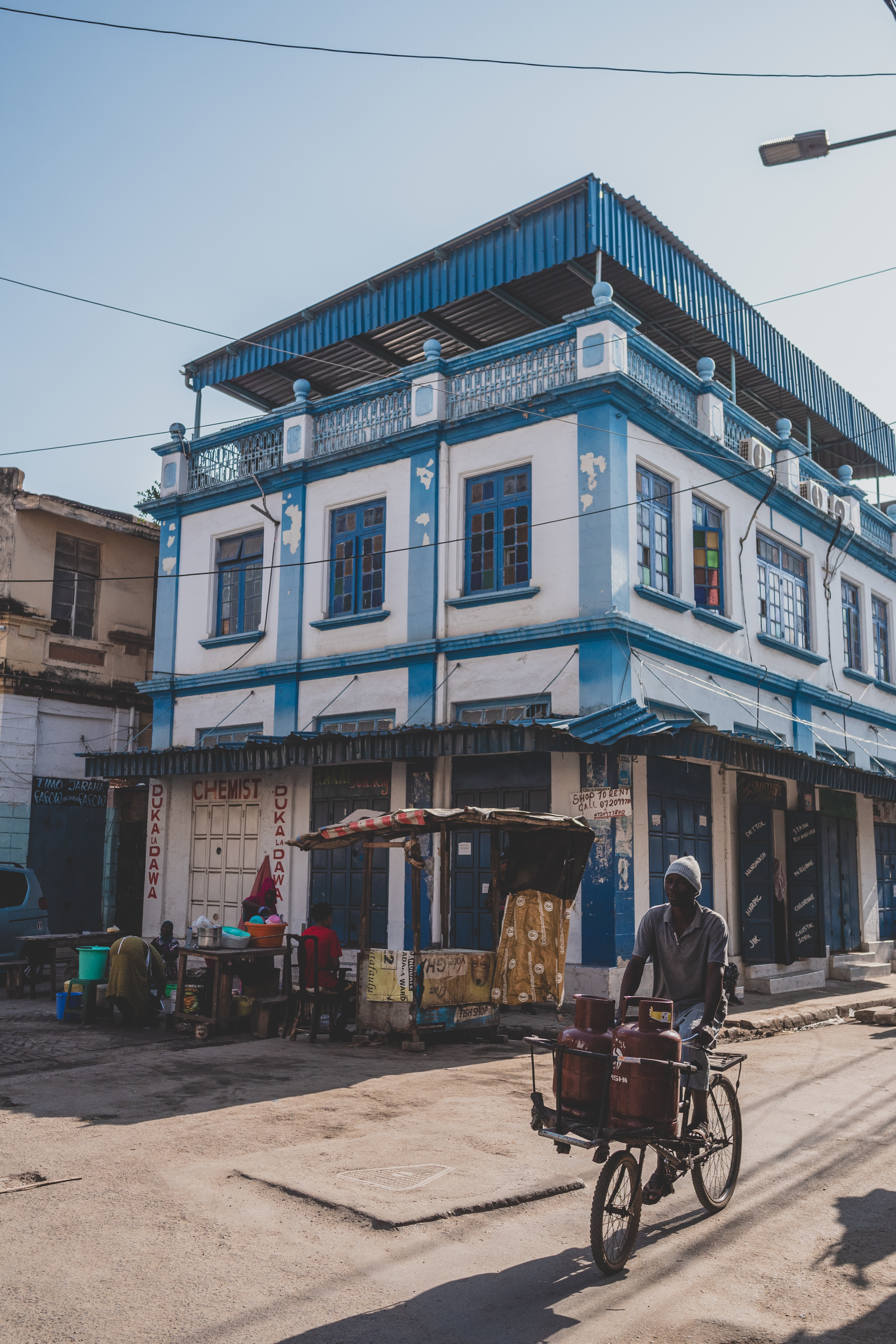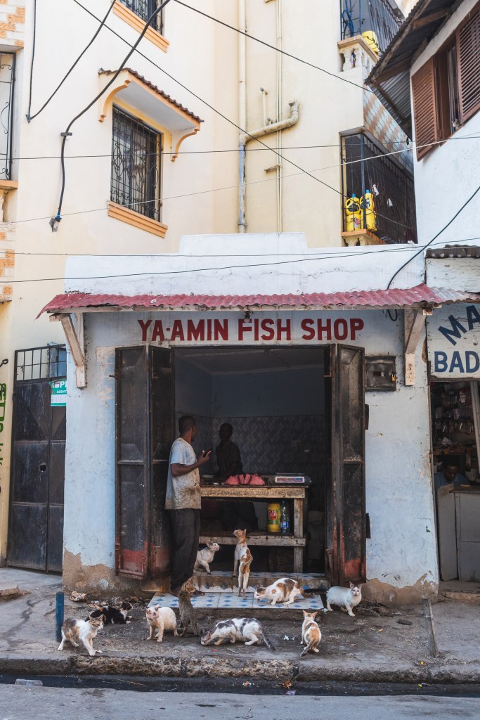 Côté architecture, Old Town fut un peu décevante. D’une part, relativement peu de maisons anciennes avaient été conservées. La plupart des bâtiments du quartier étaient récents, souvent des immeubles de plusieurs étages sans âme qui ne donnaient pas cette impression de remonter dans le temps comme lorsqu’on visite un village médiéval préservé. Et puis la plupart des maisons anciennes, souvent de plain-pied, écrasées par les constructions environnantes, n’avaient pas vraiment de charme. Le style était très simple : une maison rectangulaire avec un toit en tôle. D’autres ressemblaient tout de même davantage à ce que l’on pouvoir voir à Zanzibar avec de massives portes de bois soigneusement sculptées et des balcons encombrés de linge et de vieilleries poussiéreuses, mais celles-ci étaient loin d’être majoritaires. Pourtant, j’aimais me promener dans ces rues et j’y revenais souvent en fin d’après-midi quand les températures devenaient plus supportables, pour observer la vie des habitants de Mombasa, les marchands de rue et leurs clients, les écoliers rentrant de l’école en uniformes colorés et les chats qui dormaient un peu partout, ne s’éveillant que lorsqu’il était temps de manger.