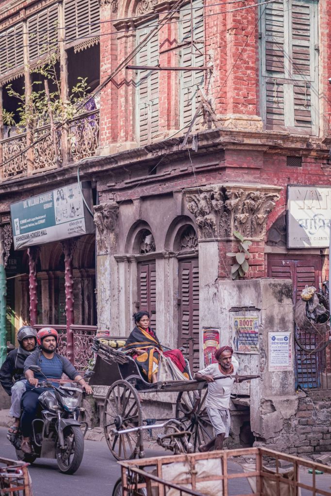 Le Kolkata Punk mêlait des éléments anciens et modernes. Il y avait d’un côté son architecture coloniale, généralement en briques, parfois imposante et prétentieuse avec son style classique, ses colonnes, mais souvent délabrée et envahie par la végétation. Les taxis Ambassador jaunes, sillonnaient toujours les rues, comme dans un vieux film, mais ils étaient cabossés et rouillés. Son tramway vétuste perçait son chemin au milieu de la circulation depuis la fin du XIXe siècle. On croisait encore ces anachroniques « hommes chevaux », des pousse-pousse tirés par des hommes au milieu des voitures et des motos, qui me rappelaient forcément le personnage de La Cité de la Joie. Il y avait aussi ces gens se lavant dans la rue à grandes eaux grâce aux robinets publics. Et les Brahmanes, chandan sur le front, semblaient venir de l’antiquité, effectuant leurs rituels dans les temples et les maisons et les petits commerces, accrochant des grigris de citrons et de piments – le nazar battu – pour faire fuir les mauvais esprits. La religiosité omniprésente atteignait son pic pendant la fête de Durga à l’automne. Mais de l’autre côté il y avait aussi son métro récent, ses voitures électriques, ses enseignes lumineuses et des QR Codes Google Pay et Phone Pe jusque sur la roulotte du vendeur de rue. Le tout dans un chaos très indien évidemment. La ville était un palimpseste où toutes les époques se superposaient.
